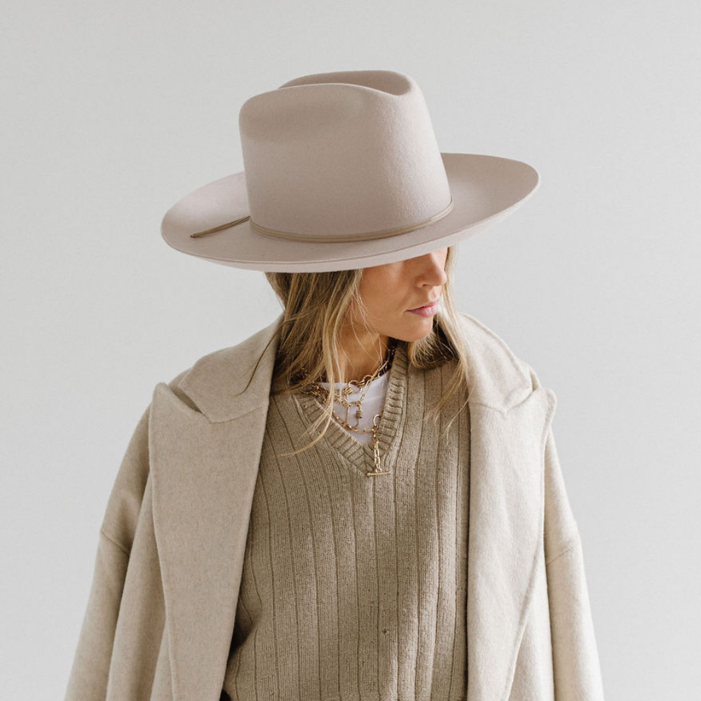 The Ezra Western Hat blends bold statement fashion with classic Western roots. Featuring a traditional cattleman crown and upturned brim, Ezra is designed to be worn from city streets to countryside escapes. The tall crown gives it a refined, feminine edge, while the structured shape keeps it timeless yet fashion-forward. Ezra comes with a removable tonal grosgrain band, finished with a Gigi Pip pin for a touch of signature detail. Want to switch up your look? Additional bands are sold separately for easy customization. Whether you’re styling it up for an event or keeping things casual, the Ezra Hat delivers modern Western vibes with elevated ease. It’s a versatile staple for every hat lover’s wardrobe.