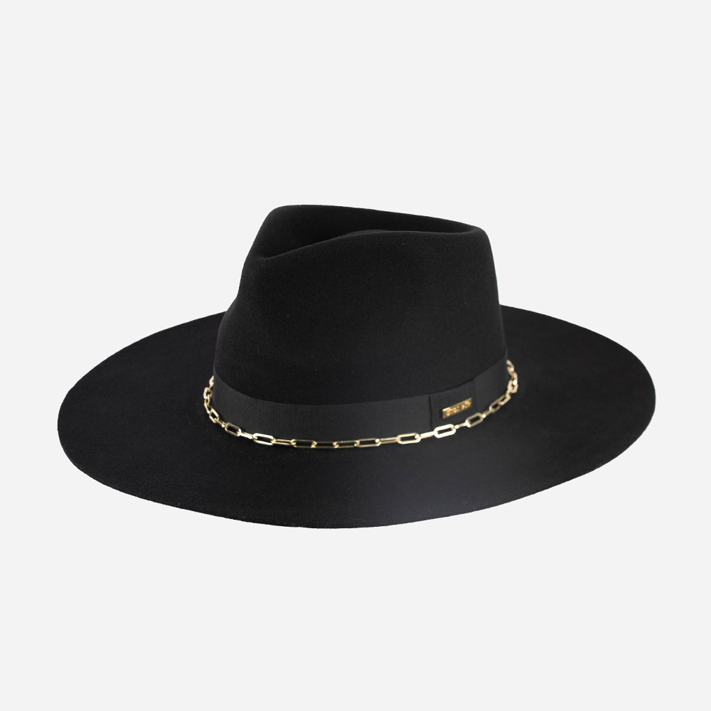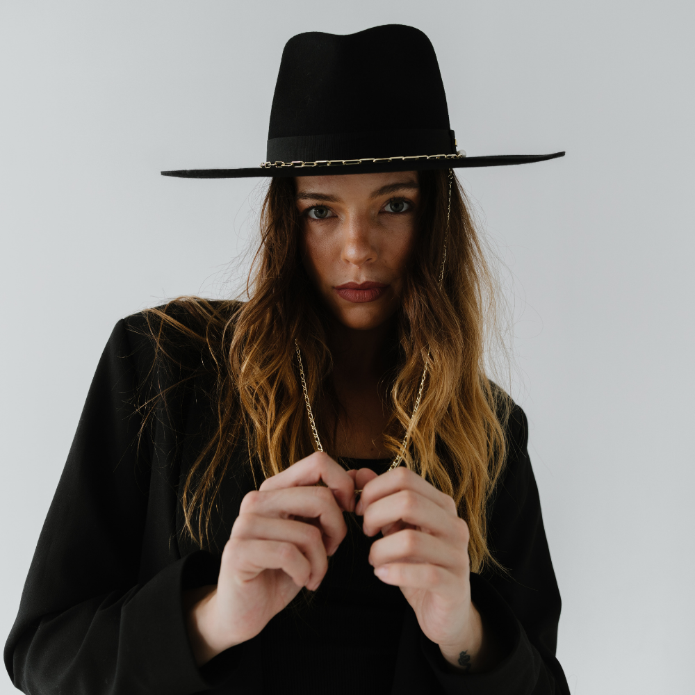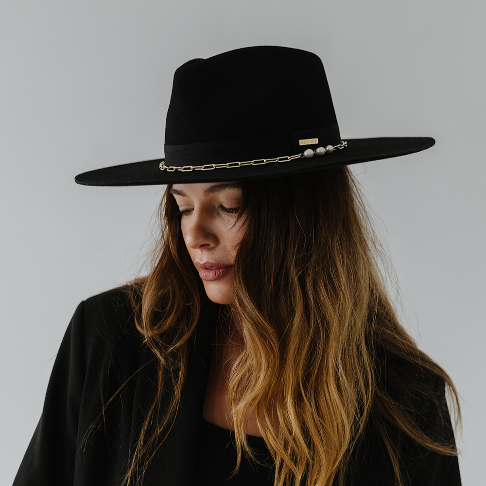 The Raine Wide Brim Fedora Hat is all about versatility—designed for the woman who loves to switch things up with ease. Featuring our first-ever chain chinstrap, this style includes a removable brass paperclip chain adorned with three elegant pearls for a bold, elevated touch. Wear it clipped in for an edgy statement, or remove it for a more classic vibe. Beneath it all, Raine is a timeless wide brim fedora, finished with a hand-sewn grosgrain band and our signature gold Gigi Pip bar for refined detail. Whether you’re going minimal or full glam, Raine adapts to your mood and style, giving you endless ways to wear one beautifully made hat.